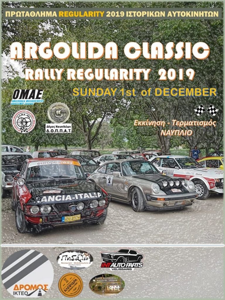 Η Αργολική Λέσχη Μηχανοκίνητου Αθλητισμού Α.Λ.Μ.Α 4Χ4 Ναυπλίου με την υποστήριξη του ΔΟΠΠΑΤ του Δήμου Ναυπλιέων, διοργανώνει την Κυριακή 1 Δεκεμβρίου 2019 τον τελευταίο αγώνα κλασσικών αυτοκινήτων του Πανελληνίου Πρωταθλήματος της Ο.Μ.Α.Ε., το “ARGOLIDA CLASIIC RALLY REGULARITY 2019”.