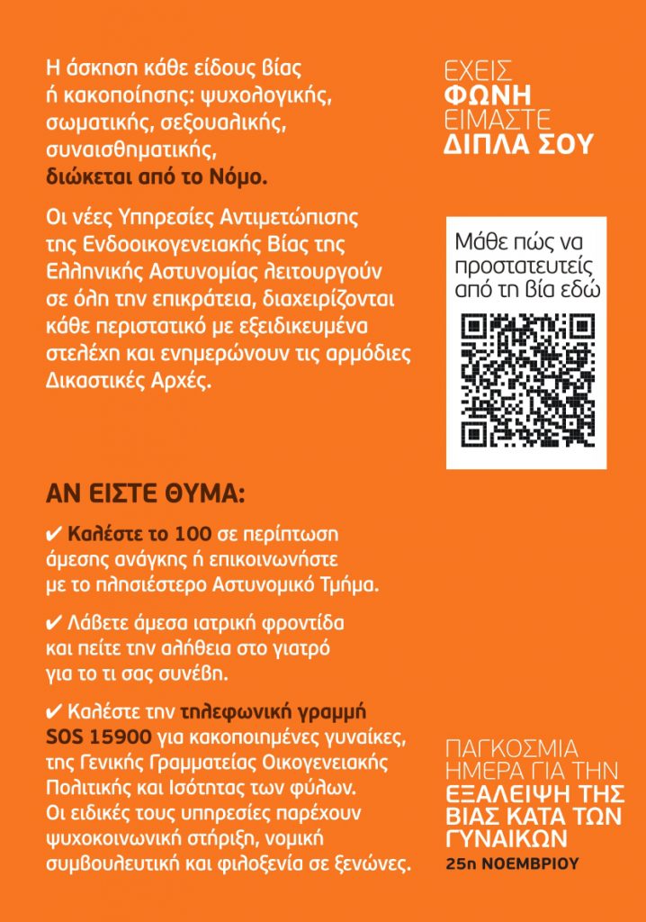 ΒΙΝΤΕΟ: Το μήνυμα της ΕΛ.ΑΣ για την Παγκόσμια Ημέρα Εξάλειψης της Βίας κατά των γυναικών 25/11/201925/11/2019 - by ΕΔΩ ΠΕΛΟΠΟΝΝΗΣΟΣ - Αφήστε ένα σχόλιο Το κοινωνικό μήνυμα της ΕΛ.ΑΣ για σήμερα 25η Νοεμβρίου, Παγκόσμια Ημέρα Εξάλειψης της Βίας κατά των γυναικών