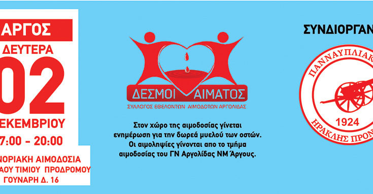 Σας καλούμε στην 124η εθελοντική αιμοδοσία του συλλόγου μας και 1η ενοριακή αιμοδοσία του Ιερού Ναού Τιμίου Προδρόμου που θα πραγματοποιηθεί την Δευτέρα 2 Δεκεμβρίου από τις 5:00μμ έως τις 8:00μμ στον Ιερό Ναό Τιμίου Προδρόμου (Γούναρη Δ. 16, Άργος) η οποία συνδιοργανώνεται και υποστηρίζεται από το αθλητικό σωματείο Πανναυπλιακός – Ηρακλής Γ.Σ.