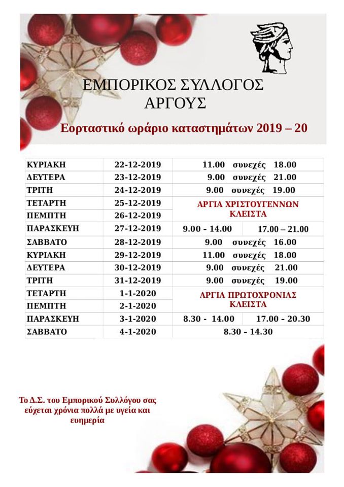 Το εορταστικό ωράριο των εμπορικών καταστημάτων στο Άργος 06/12/201906/12/2019 - by ΕΔΩ ΠΕΛΟΠΟΝΝΗΣΟΣ - Αφήστε ένα σχόλιο