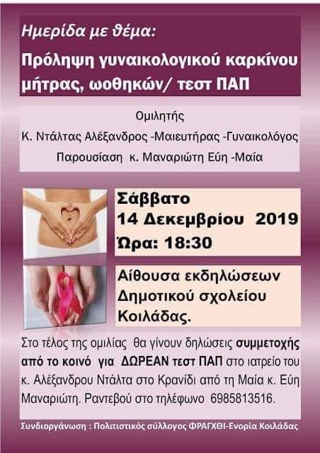 ΕΡΜΙΟΝΙΔΑ: Ημερίδα για την πρόληψη γυναικολογικού καρκίνου μήτρας, ωοθηκών -τεστ ΠΑΠ 13/12/201913/12/2019 - by ΕΔΩ ΠΕΛΟΠΟΝΝΗΣΟΣ - Αφήστε ένα σχόλιο
