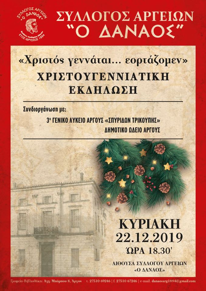 Hλθαν τα Χριστούγεννα !! Στον 125χρονο (!) πλέον, αλλα πάντα δυναμικά παρόντα Δαναό, “Εορτάζομεν” την Γέννηση του Χριστού την Κυριακή [22/12] με τα παιδιά της πόλης ! Με τα λόγια τους, με τα τραγούδια τους και με τις μουσικές τους ! Πολλές ευχαριστίες στα παιδιά και τους υπεύθυνους απ΄ το 3ο Γεν.Λύκειο Αργους και το Δημοτικό μας Ωδείο για την συνδιοργάνωση και την συμμετοχή τους σ΄αυτήν την όμορφη γιορτή !