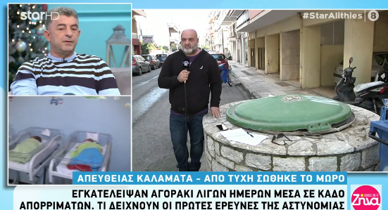 Φρίκη έχει προκαλέσει στην τοπική κοινωνία της Καλαμάτας αλλά και σε ολόκληρη την Ελλάδα η είδηση ότι νωρίς το πρωί της Τετάρτης 18/12 εντοπίστηκε νεογέννητο βρέφος σε κάδο σκουπιδιών. Μάλιστα, όπως δήλωσε στην ΕΡΤ ο δήμαρχος της πόλης Α. Βασιλόπουλος, το μωρό σώθηκε από θαύμα, καθώς το απορριμματοφόρο καθυστέρησε να περάσει από το σημείο για την αποκομιδή των σκουπιδιών.