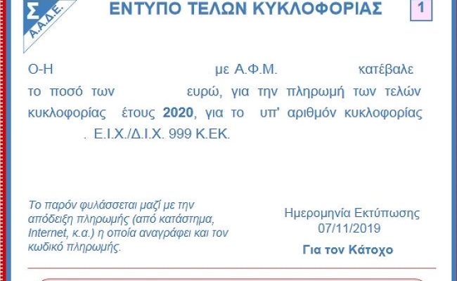 Να σημειωθεί πως όσοι πληρώσουν εκπρόθεσμα τα τέλη κυκλοφορίας (δηλαδή μετά τις 15 Ιανουαρίου 2020) είναι αντιμέτωποι με πρόστιμο διπλάσιο των τελών κυκλοφορίας που αντιστοιχούν στο όχημά τους.