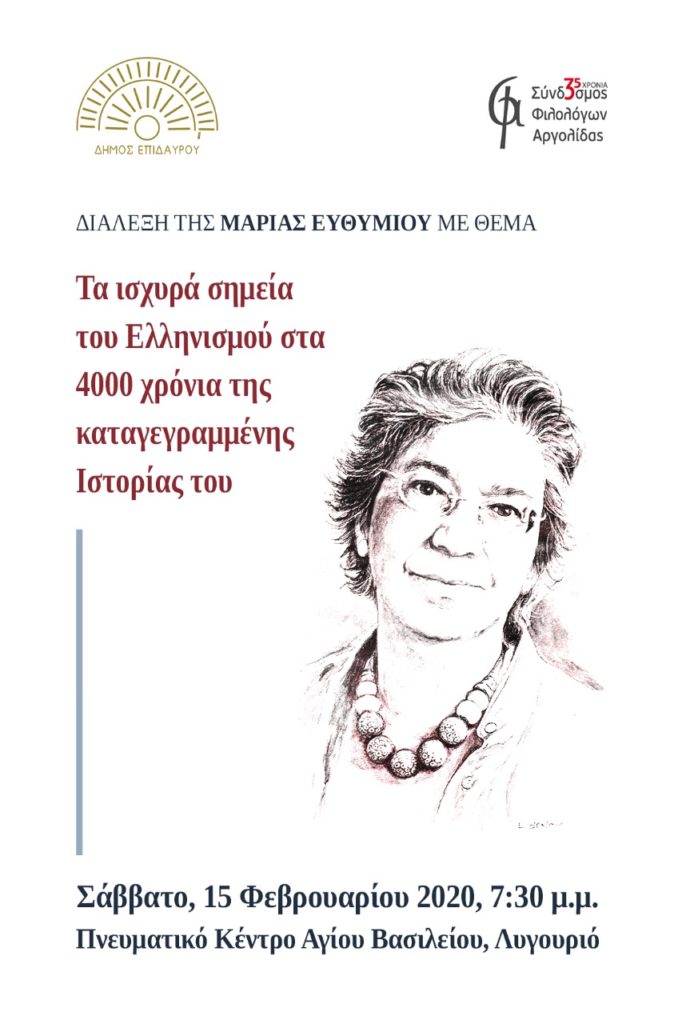 Ο Δήμος Επιδαύρου και ο Σύνδεσμος Φιλολόγων Αργολίδας συνδιοργανώνουν Διάλεξη της Καθηγήτριας Ιστορίας του Νέου Ελληνισμού του ΕΚΠΑ και Επίτιμου μέλους του ΣΦΑ κ. Μαρίας Δ. Ευθυμίου με θέμα Τα ισχυρά σημεία του Ελληνισμού στα 4000 χρόνια της καταγεγραμμένης Ιστορίας του .Η εν λόγω εκδήλωση αποτελεί την απαρχή μιας ευρύτερης συνεργασίας μεταξύ του Συνδέσμου Φιλολόγων Αργολίδας και του Δήμου Επιδαύρου, με ορίζοντα και τις εκδηλώσεις για τα 200 χρόνια από την έναρξη της Ελληνικής Επανάστασης.