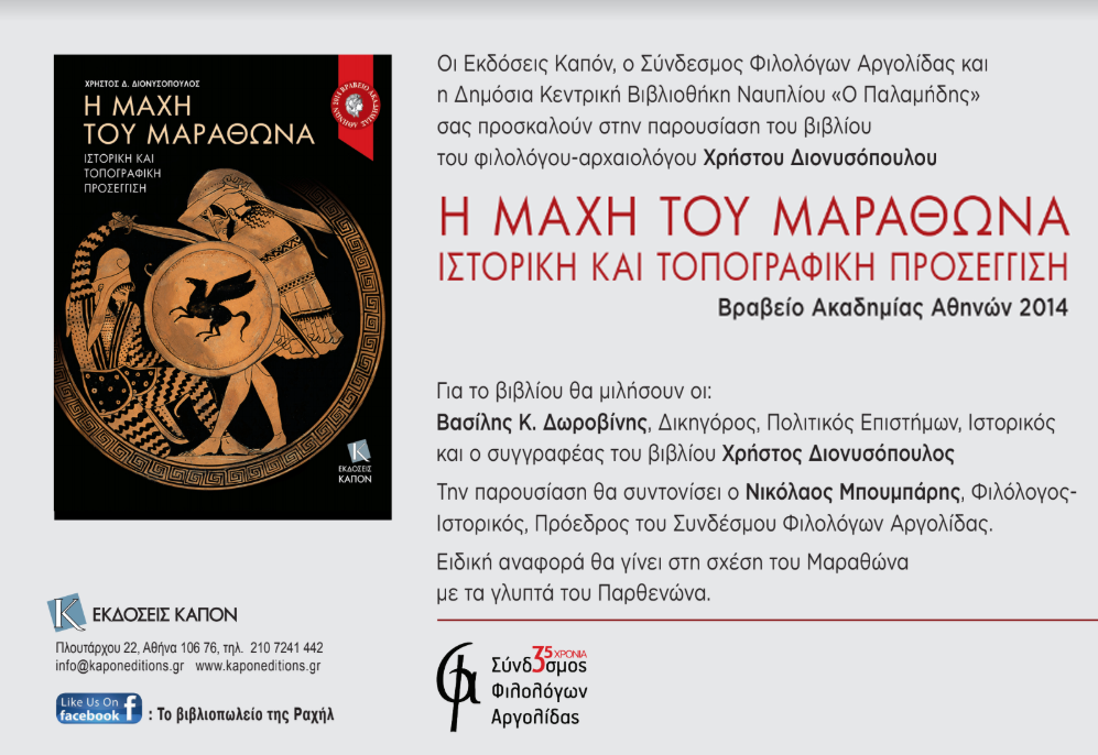 Οι Εκδόσεις ΚΑΠΟΝ, Η Δημόσια Κεντρική Βιβλιοθήκη Ναυπλίου Ο ΠΑΛΑΜΗΔΗΣ και ο Σύνδεσμος Φιλολόγων Αργολίδας παρουσιάζουν το Σάββατο 7 Μαρτίου και ώρα 19:30 στη Δημόσια Κεντρική Βιβλιοθήκη Ναυπλίου Ο ΠΑΛΑΜΗΔΗΣ στο Ναύπλιο το βραβευμένο από την Ακαδημία Αθηνών (το 2014) βιβλίο του κ. Χρήστου Διονυσόπουλου, Φιλολόγου και Αρχαιολόγου Η μάχη του Μαραθώνα, Ιστορική και Τοπογραφική Προσέγγιση(εκδ. ΚΑΠΟΝ).