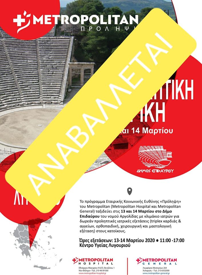 Μετα απο επικοινωνία με το Κέντρο Υγείας αλλά και με την εξαγγελία των νέων μέτρων κατά της εξάπλωσης του κορωνοϊού δυστυχώς ο δωρεάν προληπτικός έλεγχος αναβάλλεται για τον Ιούνιο.