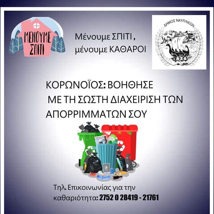 Στην κατάρτιση οδηγιών για τη σωστή διαχείριση και συσκευασία των απορριμμάτων κατά την περίοδο εφαρμογής των προληπτικών μέτρων για τον κορωνοϊό, προχώρησε ο Δήμος Ναυπλιέων, μετά από εντολή του Δημάρχου @dimkostouros , σε συνεργασία με υπηρεσιακούς παράγοντες και συνεργάτες.