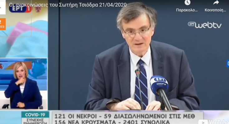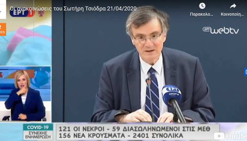 Τα στοιχεία για την πορεία της πανδημίας στην Ελλάδα, το τελευταίο εικοσιτετράωρο ανακοίνωσε ο εκπρόσωπος του υπουργείου Υγείας για τον κορωνοϊό, καθηγητής Λοιμωξιολογίας, Σωτήρης Τσιόδρας. Όπως είπε, συνολικά το τελευταίο 24ωρο καταγράφηκαν 156 νέα κρούσματα, εκ των οποίων τα 150 επιβεβαιώθηκαν στη δομή φιλοξενίας προσφύγων στο Κρανίδι, ανεβάζοντας τον συνλικό αριθμό στην Ελλάδα στα 2.401. Επίσης ανακοίνωσε ότι οι νεκροί πλέον φθάνουν τους 121, καθώς άλλοι πέντε άνθρωποι κατέληξαν μέσα στο τελευταίο εικοσιτετράωρο. Συνολικά 59 ασθενείς βρίσκονται διασωληνωμένοι στις εντατικές των νοσοκομείων αναφοράς, εκ των οποίων γυναίκες είναι οι 16. Από τις ΜΕΘ έχουν πάρει εξιτήριο 46 ασθενείς.