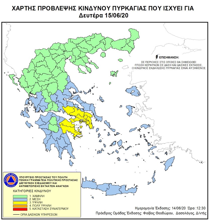 Σύμφωνα με το Χάρτη Πρόβλεψης Κινδύνου Πυρκαγιάς που εκδίδει η Γενική Γραμματεία Πολιτικής Προστασίας για αύριο Δευτέρα 15 Ιουνίου , προβλέπεται υψηλός κίνδυνος πυρκαγιάς (κατηγορία κινδύνου 3) στην περιοχή της Αττικής, Αργολίδας, Βοιωτίας & Κορινθίας