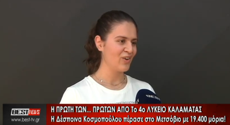 Ο λόγος για τη Δέσποινα Κοσμοπούλου από την Καλαμάτα, η οποία αποφοίτησε από το 4ο Λύκειο και αρίστευσε, συγκεντρώνοντας 19.400 μόρια, κάνοντας το όνειρό της για σπουδές στο Εθνικό Μετσόβιο Πολυτεχνείο, αρκετά εύκολη υπόθεση τελικά. Η νεαρή κοπέλα, μίλησε στην τηλεόραση Best για την επιτυχία της και τη διαδικασία των εξετάσεων.