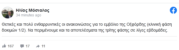 Ελπίδες σε εκατομμύρια ανθρώπους παγκοσμίως γεννούν οι ανακοινώσεις που έγιναν το απόγευμα της Δευτέρας, 20 Ιουλίου, σχετικά με το εμβόλιο της Οξφόρδης κατά του κορονοϊού από το Πανεπιστήμιο της Οξφόρδης. Το Πανεπιστήμιο της Οξφόρδης χαρακτηρίζει ασφαλές για τον οργανισμό το πολυαναμενόμενο εμβόλιο κατά του κορονοϊού. Το γεγονός σχολίασε με αναρτησή του στο facebook και ο καθηγητής του London School of Economics, Ηλίας Μόσιαλος. «Θετικές και πολύ ενθαρρυντικές οι ανακοινώσεις για το εμβόλιο της Οξφόρδης (κλινική φάση δοκιμών 1/2). Να περιμένουμε και τα αποτελέσματα της τρίτης φάσης σε λίγες εβδομάδες» ανέφερε χαρακτηριστικά.