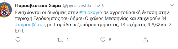 ΜΕΣΣΗΝΙΑ: Μεγάλη πυρκαγιά στον Ξερόκαμπο Δήμου Οιχαλίας 05/09/202005/09/2020 - by ΕΔΩ ΠΕΛΟΠΟΝΝΗΣΟΣ - Αφήστε ένα σχόλιο Πυρκαγιά εκδηλώθηκε σήμερα νωρίς το απόγευμα σε αγροτοδασική έκταση στην περιο9χή Ξερόκαμπος στον Δήμο Οιχαλίας. Όπως αναφέρει το Πυροσβεστικό Σώμα: φωτο αρχείου