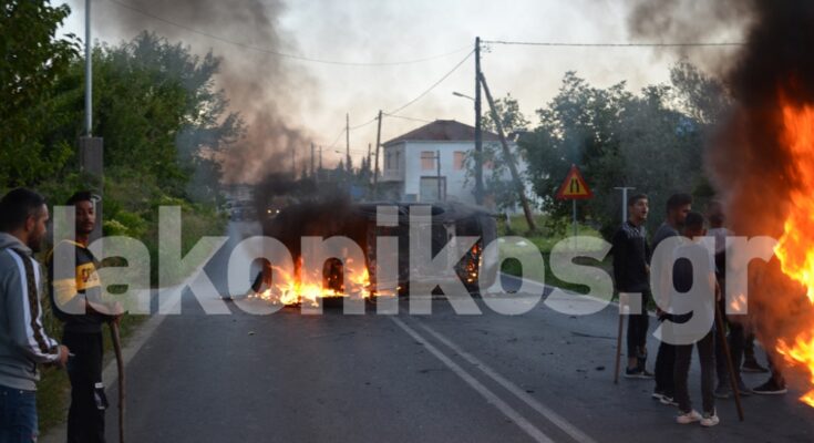 Οδοφράγματα και φωτιές στήθηκαν επί της Εθνικής οδού Σπάρτης-Γυθείου, στην είσοδο των Αμυκλών, από τις 5 περίπου το απόγευμα της Δευτέρας 26/11. Φλεγόμενο όχημα και κάδοι και εξοργισμένοι αθίγγανοι απέκλεισαν πλήρως την κυκλοφορία.