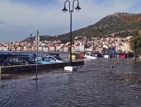 Στο βίντεο που ανέβασε στο Facebook κάτοικος του νησιού, τα νερά της θάλασσας βγήκαν στη στεριά και πλημμύρισαν τους δρόμους. …