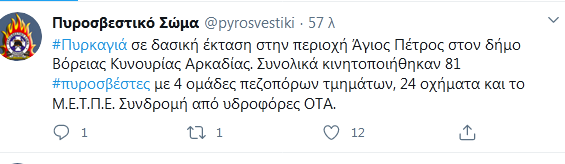 Πυρκαγιά εκδηλώθηκε σήμερα Τρίτη 24 Νοεμβρίου αργά το απόγευμα σε δασική έκταση στον Άγιο Πέτρο του Δήμου Βόρειας Κυνουρίας με μεγάλη κινητοποίηση της Πυροσβεστικής.