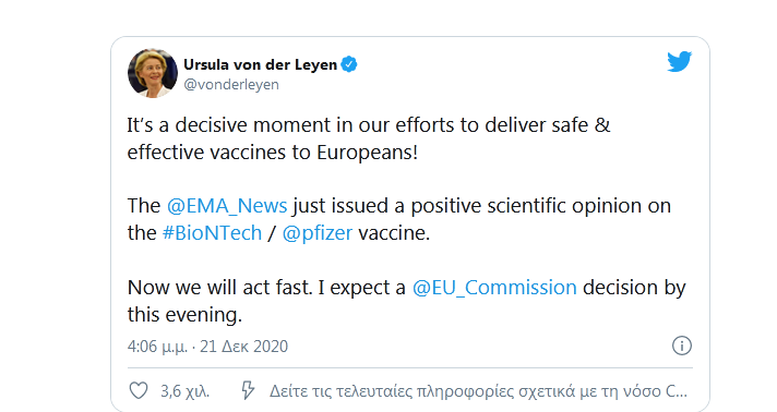 Πλέον η Ευρωπαϊκή Επιτροπή μπορεί να προχωρήσει στην αδειοδότηση του εμβολίου για κυκλοφορία στην αγορά της ΕΕ, κάτι που όπως είπε η Ούρσουλα φον ντερ Λάιεν θα έχει γίνει μέχρι το βράδυ.