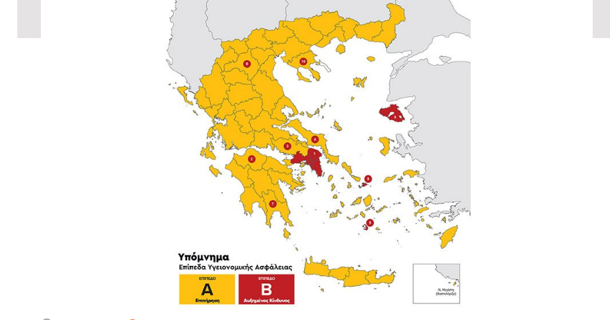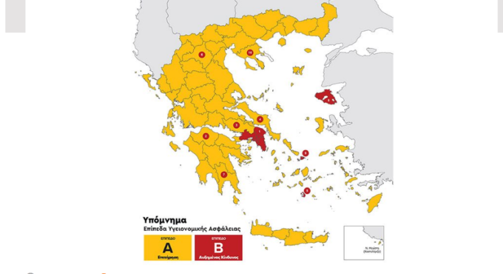 Επανερχόμαστε στο χάρτη επιδημιολογικής κατάστασης. Επίπεδο Α (κίτρινο) και επίπεδο Β (κόκκινο). Και στα δύο επίπεδα ισχύουν οριζόντια μέτρα, όπως τα γνωρίζουμε. Στο επίπεδο Β θα ισχύουν επιπλέον μέτρα.