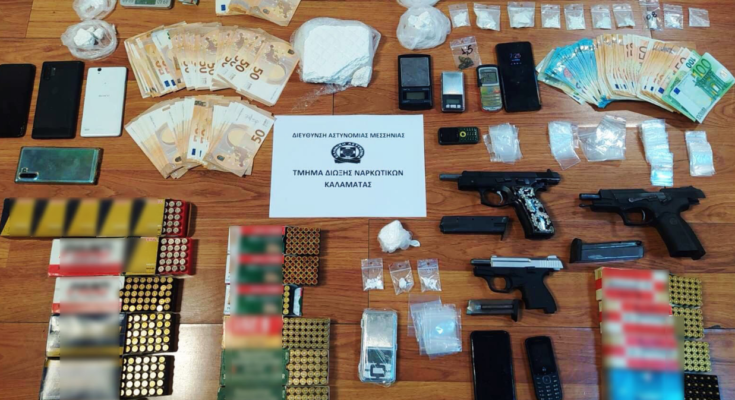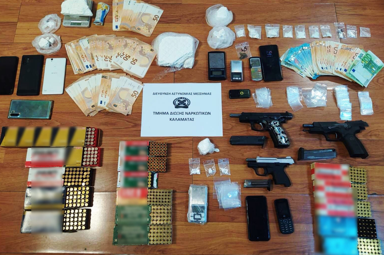 Ειδικότερα, χθες (8.3.2021) το πρωί , ύστερα από κατάλληλη αξιολόγηση και αξιοποίηση στοιχείων και μετά από οργανωμένη αστυνομική επιχείρηση, αστυνομικοί του Τμήματος Δίωξης Ναρκωτικών της Υποδιεύθυνσης Ασφάλειας Καλαμάτας, σε συνεργασία με αστυνομικούς της Υποδιεύθυνσης Δίωξης Ναρκωτικών της Διεύθυνσης Ασφάλειας Αττικής και της Ομάδας Πρόληψης και Καταστολής του Εγκλήματος (Ο.Π.Κ.Ε.) Μεσσηνίας, πραγματοποίησαν έρευνες σε οικίες των ανωτέρω, τις οποίες χρησιμοποιούσαν για την απόκρυψη και αποθήκευση ναρκωτικών ουσιών, όπου βρήκαν συνολικά και κατέσχεσαν: