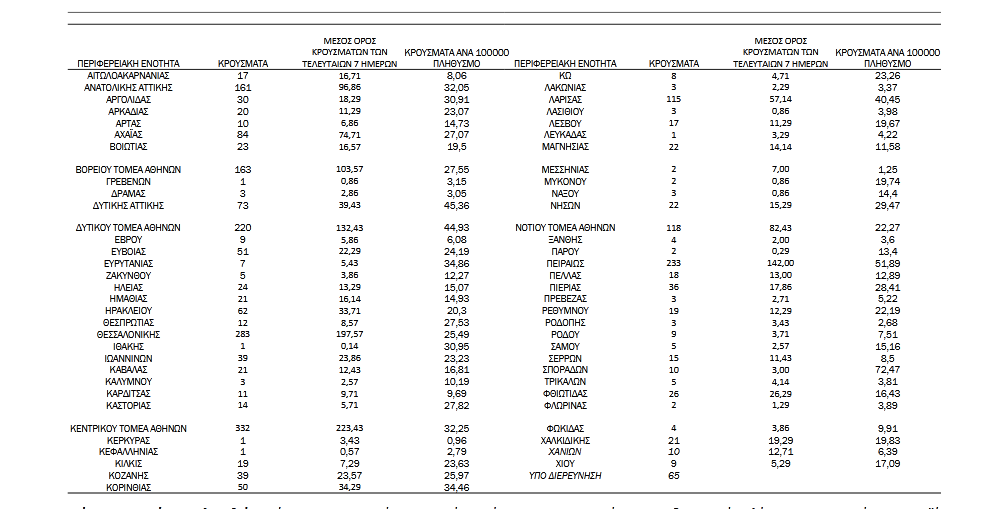 Στην Αργολίδα εντοπίστηκαν 30 νέα κρούσματα, στην Αρκαδία 20, στην Κορινθία 50, στη Λακωνία 3 και στη Μεσσηνία 2
