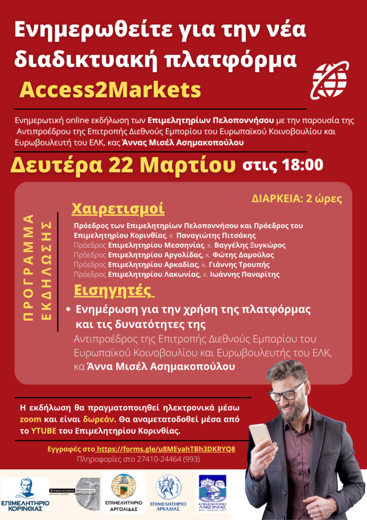 Το Περιφερειακό Επιμελητηριακό Συμβούλιο Πελοποννήσου και η Αντιπρόεδρος της Επιτροπής Διεθνούς Εμπορίου του Ευρωπαϊκού Κοινοβουλίου και Ευρωβουλευτής του ΕΛΚ, κα Άννα Μισέλ Ασημακοπούλου σας προσκαλούν σε ενημερωτική ημερίδα για την νέα διαδικτυακή πλατφόρμα της Γενικής Διεύθυνσης Εμπορίου της Ευρωπαϊκής Επιτροπής με τίτλο “Access2Markets”, την Δευτέρα 22 Μαρτίου, στις 18:00.