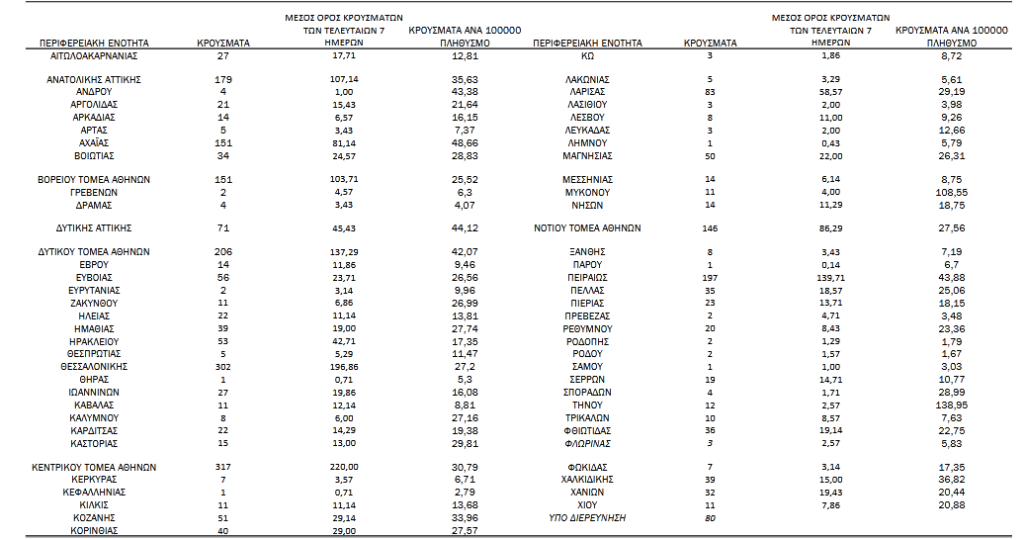 Με βάση τα επιβεβαιωμένα κρούσματα των τελευταίων 7 ημερών, 75 θεωρούνται σχετιζόμενα με ταξίδι από το εξωτερικό και 2.101 είναι σχετιζόμενα με ήδη γνωστό κρούσμα.