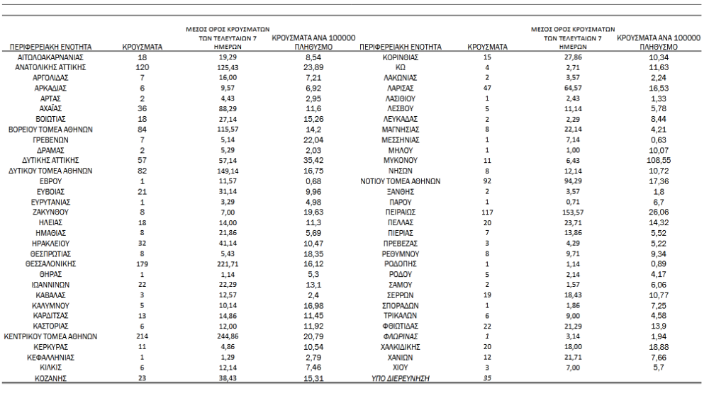 Στην Αργολίδα εντοπίστηκαν 7 νέα κρούσματα, στην Αρκαδία 6, στην Κορινθία 15, στη Λακωνία 2 και στη Μεσσηνία 1