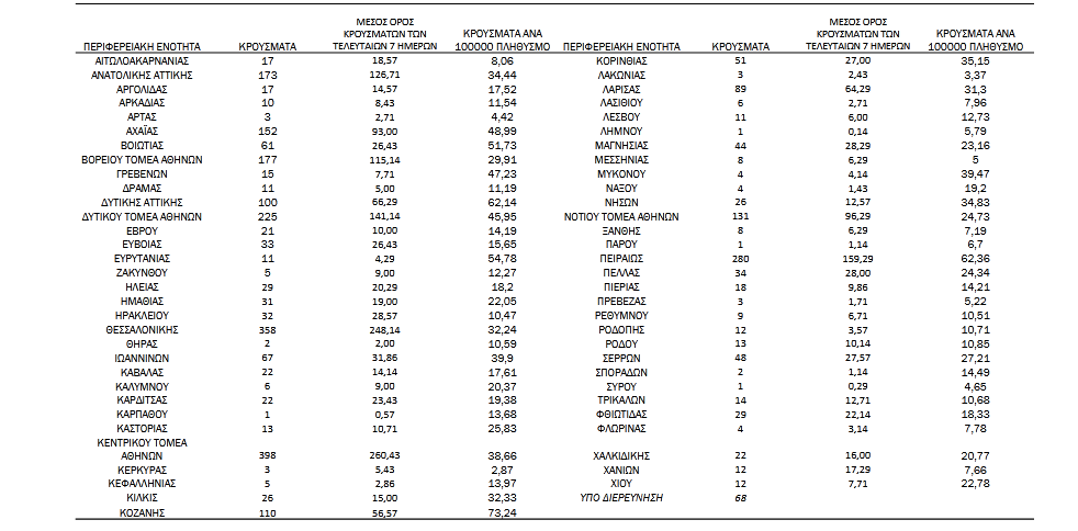 Με βάση τα επιβεβαιωμένα κρούσματα των τελευταίων 7 ημερών, 60 θεωρούνται σχετιζόμενα με ταξίδι από το εξωτερικό και 2.545 είναι σχετιζόμενα με ήδη γνωστό κρούσμα.