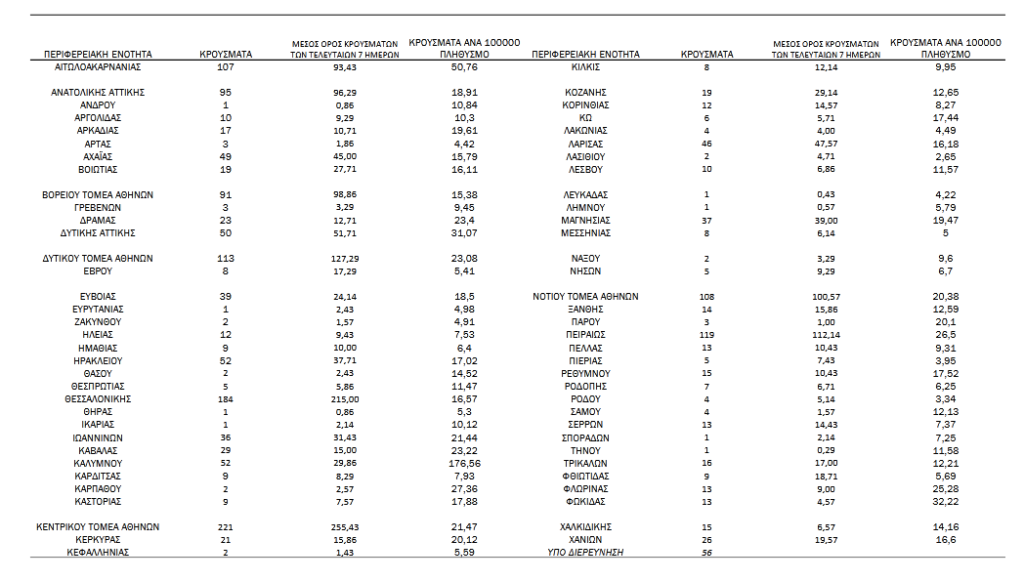 Με βάση τα επιβεβαιωμένα κρούσματα των τελευταίων 7 ημερών, 48 θεωρούνται σχετιζόμενα με ταξίδι από το εξωτερικό και 2.456 είναι σχετιζόμενα με ήδη γνωστό κρούσμα.
