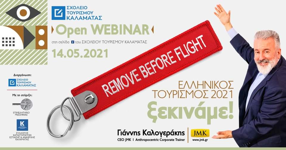 Το ΣΧΟΛΕΙΟ ΤΟΥΡΙΣΜΟΥ ΚΑΛΑΜΑΤΑΣ, μια μόλις ημέρα από την επίσημη επανέναρξη του ΕΛΛΗΝΙΚΟΥ ΤΟΥΡΙΣΜΟΥ, έχει καλεσμένο τον Δρ Γιάννη Καλογεράκη, τον #1 εμψυχωτικό ομιλητή, σε ένα free live webinar που στόχο έχει να εμψυχώσει & ενδυναμώσει ΟΛΟΥΣ όσους έχουν άμεση ή έμμεση σχέση με τον τουρισμό. Με την δράση μας αυτή, γεφυρώνουμε την απόσταση στις οθόνες μας.