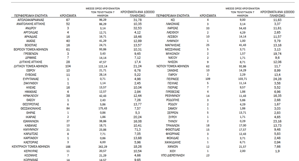 Με βάση τα επιβεβαιωμένα κρούσματα των τελευταίων 7 ημερών, 40 θεωρούνται σχετιζόμενα με ταξίδι από το εξωτερικό και 2.711 είναι σχετιζόμενα με ήδη γνωστό κρούσμα.