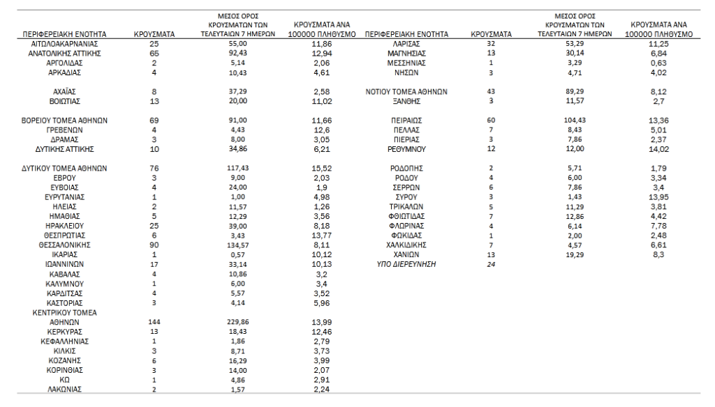 Με βάση τα επιβεβαιωμένα κρούσματα των τελευταίων 7 ημερών, 33 θεωρούνται σχετιζόμενα με ταξίδι από το εξωτερικό και 2.319 είναι σχετιζόμενα με ήδη γνωστό κρούσμα