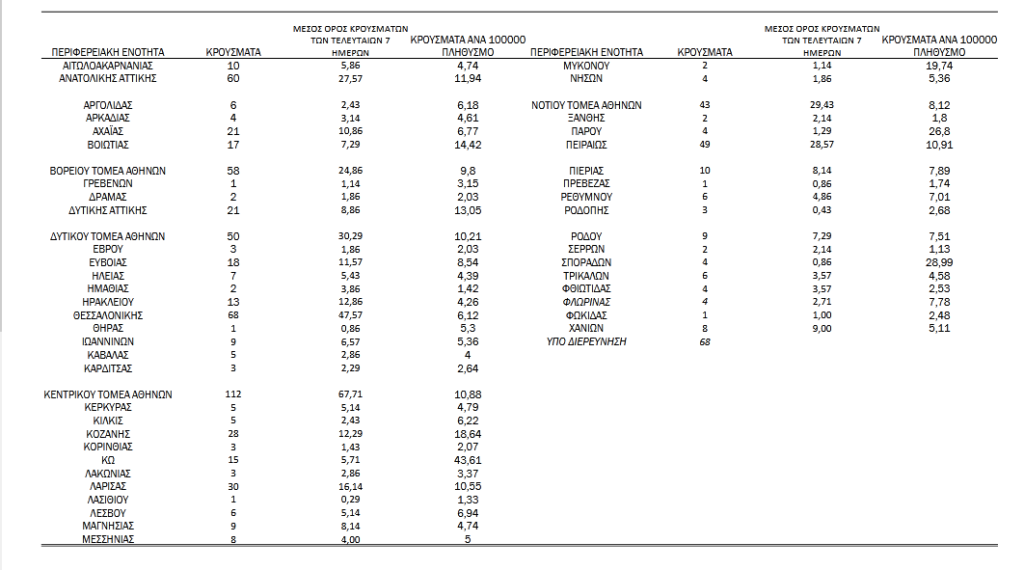 Με βάση τα επιβεβαιωμένα κρούσματα των τελευταίων 7 ημερών, 28 θεωρούνται σχετιζόμενα με ταξίδι από το εξωτερικό και 1.102 είναι σχετιζόμενα με ήδη γνωστό κρούσμα.