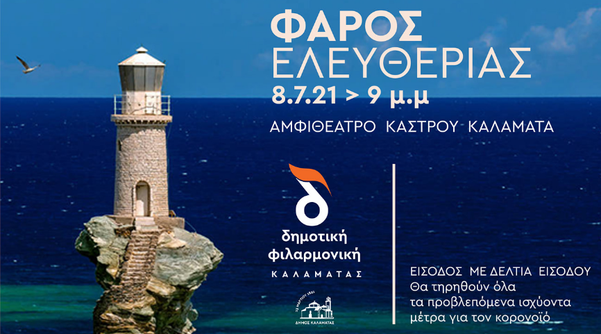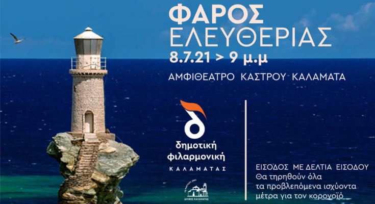 Η Δημοτική Φιλαρμονική Καλαμάτας παρουσιάζει τη μουσική εκδήλωση με τίτλο «Φάρος Ελευθερίας», με έργα Ελλήνων και φιλελλήνων συνθετών για τα 200 χρόνια ελευθερίας. Η μουσική βραδιά είναι προγραμματισμένη για την Πέμπτη 8 Ιουλίου 2021 και ώρα 21.00, στο Αμφιθέατρο Κάστρου Καλαμάτας.