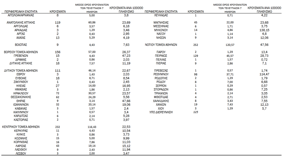 Με βάση τα επιβεβαιωμένα κρούσματα των τελευταίων 7 ημερών, 125 θεωρούνται σχετιζόμενα με ταξίδι από το εξωτερικό και 1.446 είναι σχετιζόμενα με ήδη γνωστό κρούσμα.