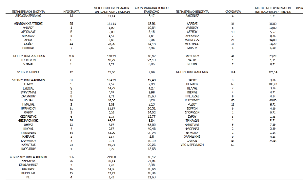 Βάσει της κατανομής των 1.433 νέων εγχώριων μολύνσεων, οι 639 καταγράφονται στην Αττική, οι 76 στη Θεσσαλονίκη, ενώ «βράζει» και η Κρήτη. Στο Ηράκλειο εντοπίστηκαν 81 νέα κρούσματα, στο Λασίθι 6, στο Ρέθυμνο 60 και στα Χανιά 42.