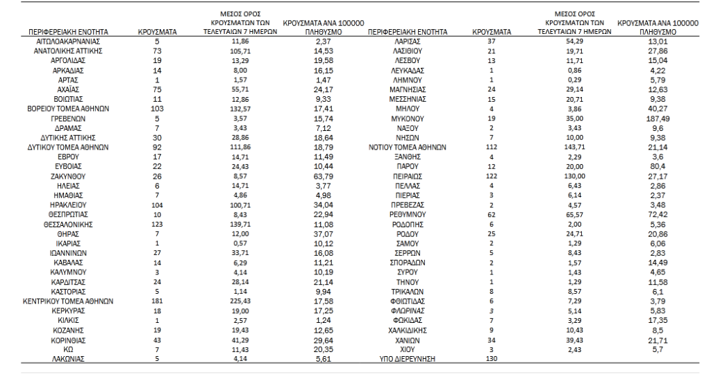 Τα νέα εργαστηριακά επιβεβαιωμένα κρούσματα της νόσου που καταγράφηκαν τις τελευταίες 24 ώρες είναι 1.834, εκ των οποίων 14 εντοπίστηκαν κατόπιν ελέγχων στις πύλες εισόδου της χώρας. Ο συνολικός αριθμός των κρουσμάτων ανέρχεται σε 459.146 (ημερήσια μεταβολή +0.4%), εκ των οποίων 51.2% άνδρες. Με βάση τα επιβεβαιωμένα κρούσματα των τελευταίων 7 ημερών, 141 θεωρούνται σχετιζόμενα με ταξίδι από το εξωτερικό και 1.360 είναι σχετιζόμενα με ήδη γνωστό κρούσμα.