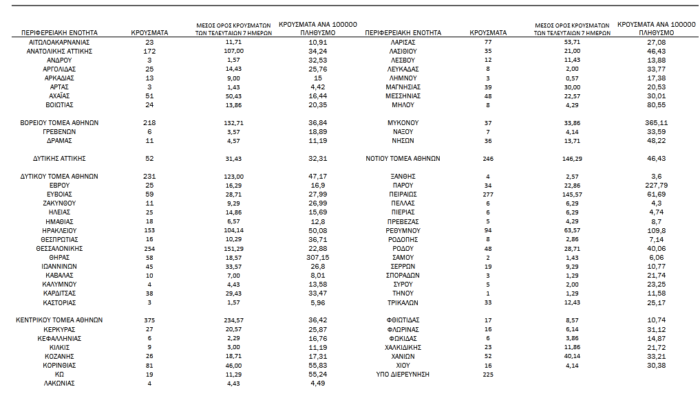 Ο συνολικός αριθμός των κρουσμάτων ανέρχεται σε 463.473 (ημερήσια μεταβολή +1.0%), εκ των οποίων 51.2% άνδρες. Με βάση τα επιβεβαιωμένα κρούσματα των τελευταίων 7 ημερών, 123 θεωρούνται σχετιζόμενα με ταξίδι από το εξωτερικό και 1.318 είναι σχετιζόμενα με ήδη γνωστό κρούσμα.
