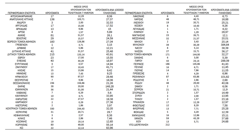 Με βάση τα επιβεβαιωμένα κρούσματα των τελευταίων 7 ημερών, 131 θεωρούνται σχετιζόμενα με ταξίδι από το εξωτερικό και 1.275 είναι σχετιζόμενα με ήδη γνωστό κρούσμα.