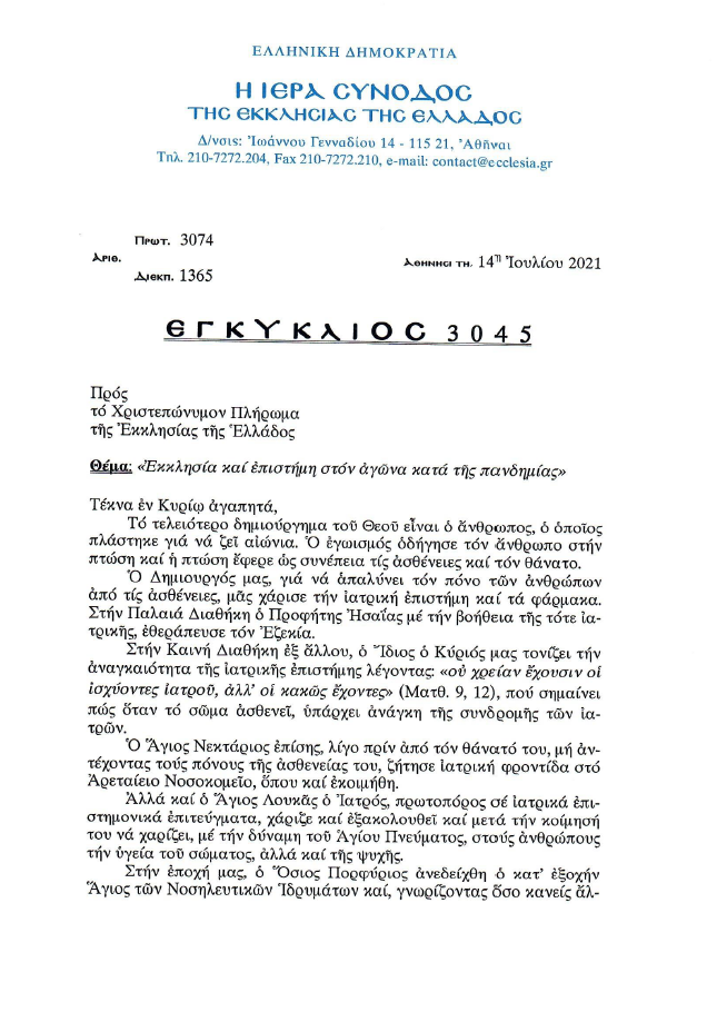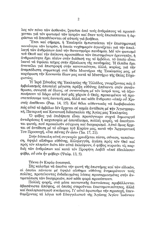 Ἡ Ἱερά Σύνοδος τῆς Ἐκκλησίας τῆς Ἑλλάδος, γνωρίζοντας πώς ὁ ἐμβολιασμός ἀποτελεῖ μέγιστη πράξη εὐθύνης ἀπέναντι στόν συνάνθρωπο, συνιστᾶ σέ ὅλους, σέ συνεννόηση μέ τόν ἰατρό τους, νά ἀξιοποιήσουν τό δῶρο αὐτό πού μᾶς χάρισε ὁ Θεός, προκειμένου νά προστατεύσουμε τούς ἑαυτούς μας, ἀλλά καί κάθε ἄνθρωπο «ὑπέρ οὗ Χριστός ἀπέθανε» (Ρωμ. 14, 15).