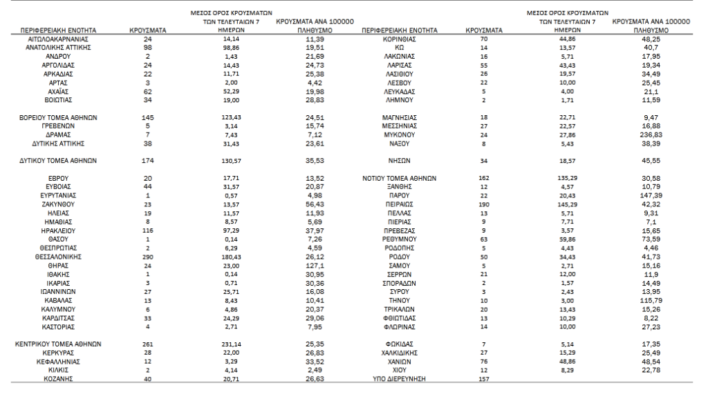 Με βάση τα επιβεβαιωμένα κρούσματα των τελευταίων 7 ημερών, 130 θεωρούνται σχετιζόμενα με ταξίδι από το εξωτερικό και 1.394 είναι σχετιζόμενα με ήδη γνωστό κρούσμα.