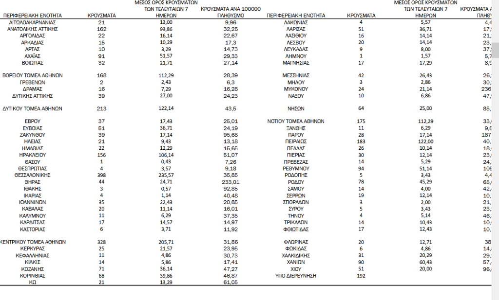 Με βάση τα επιβεβαιωμένα κρούσματα των τελευταίων 7 ημερών, 124 θεωρούνται σχετιζόμενα με ταξίδι από το εξωτερικό και 1.343 είναι σχετιζόμενα με ήδη γνωστό κρούσμα.