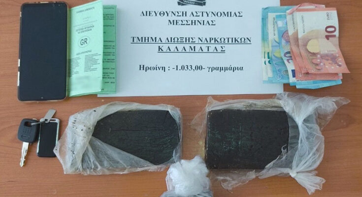 Ειδικότερα, χθες (1.8.2021) το πρωί , ύστερα από κατάλληλη αξιολόγηση και αξιοποίηση στοιχείων του Τμήματος Δίωξης Ναρκωτικών της Υποδιεύθυνσης Ασφάλειας Καλαμάτας και μετά από οργανωμένη αστυνομική επιχείρηση, οι παραπάνω αστυνομικοί πραγματοποίησαν έρευνα σε όχημα που επέβαινε ο ανωτέρω, όπου σε ειδική κρύπτη ανάμεσα στη φάσα και στο μεταλλικό σκελετό της πίσω πόρτας του οχήματος, βρήκαν επιμελώς κρυμμένες και κατέσχεσαν, -3- ποσότητες ηρωίνης, συνολικού βάρους -1.033- γραμμαρίων.