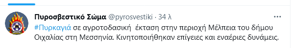 Πυρκαγιά σε εξέλιξη στη Μέλπεια Μεσσηνίας 04/08/202104/08/2021 - by ΕΔΩ ΠΕΛΟΠΟΝΝΗΣΟΣ - Αφήστε ένα σχόλιο Πυρκαγιά εκδηλώθηκε σήμερα Τετάρτη 4 Αυγούστου απογευματινές ώρες σε έκταση κοντά στην Κάτω Μέλπεια του Δήμου Οιχαλίας στη Μεσσηνία Σύμφωνα με ενημέρωση του Πυροσβεστικού Σώματος: φωτο αρχείου