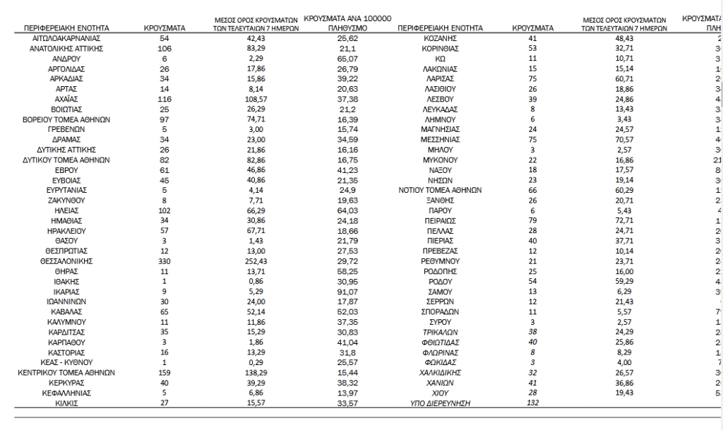 Με βάση τα επιβεβαιωμένα κρούσματα των τελευταίων 7 ημερών, 185 θεωρούνται σχετιζόμενα με ταξίδι από το εξωτερικό και 1.378 είναι σχετιζόμενα με ήδη γνωστό κρούσμα. To 𝑅𝑡 για την επικράτεια βάσει των κρουσμάτων εκτιμάται σε 0.99 (95% ΔΕ: 0.89 – 1.11)