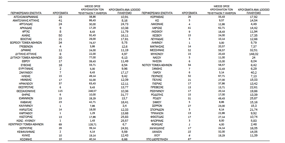 Με βάση τα επιβεβαιωμένα κρούσματα των τελευταίων 7 ημερών, 155 θεωρούνται σχετιζόμενα με ταξίδι από το εξωτερικό και 1.591 είναι σχετιζόμενα με ήδη γνωστό κρούσμα.