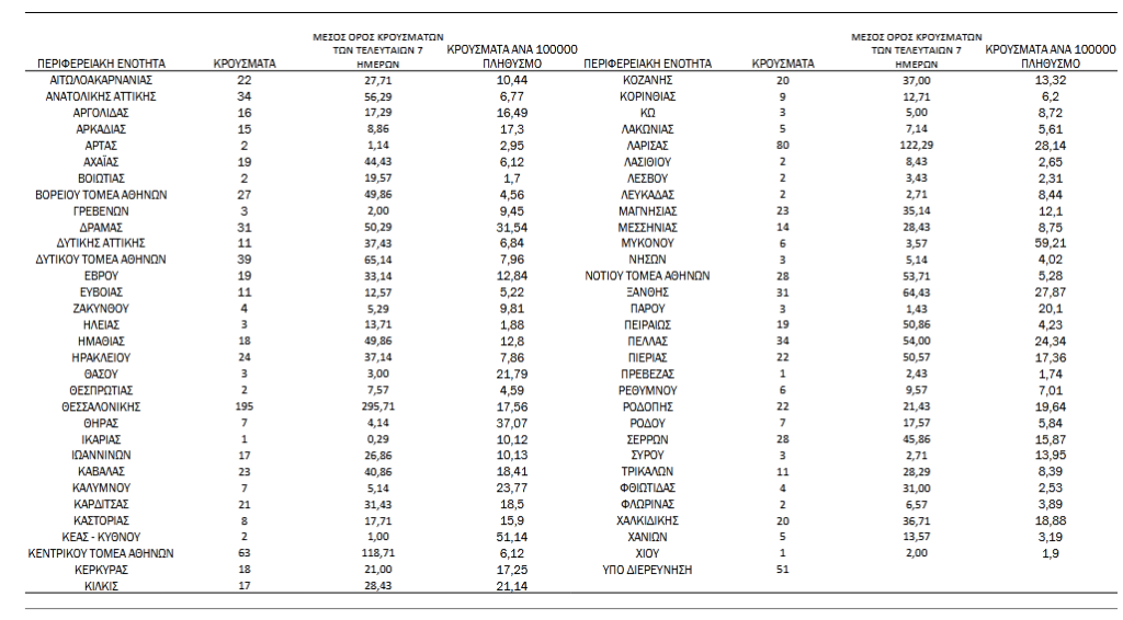 - Με βάση τα επιβεβαιωμένα κρούσματα των τελευταίων 7 ημερών, 85 θεωρούνται σχετιζόμενα με ταξίδι από το εξωτερικό και 3.228 είναι σχετιζόμενα με ήδη γνωστό κρούσμα