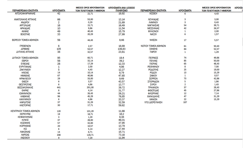 Με βάση τα επιβεβαιωμένα κρούσματα των τελευταίων 7 ημερών, 99 θεωρούνται σχετιζόμενα με ταξίδι από το εξωτερικό και 2.837 είναι σχετιζόμενα με ήδη γνωστό κρούσμα.