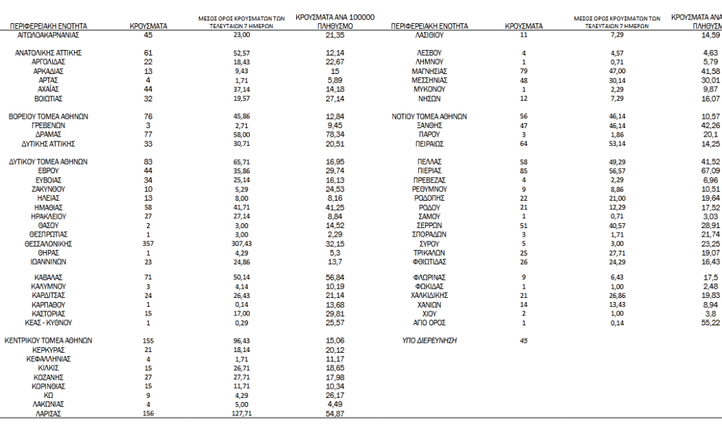Με βάση τα επιβεβαιωμένα κρούσματα των τελευταίων 7 ημερών, 119 θεωρούνται σχετιζόμενα με ταξίδι από το εξωτερικό και 3.287 είναι σχετιζόμενα με ήδη γνωστό κρούσμα.