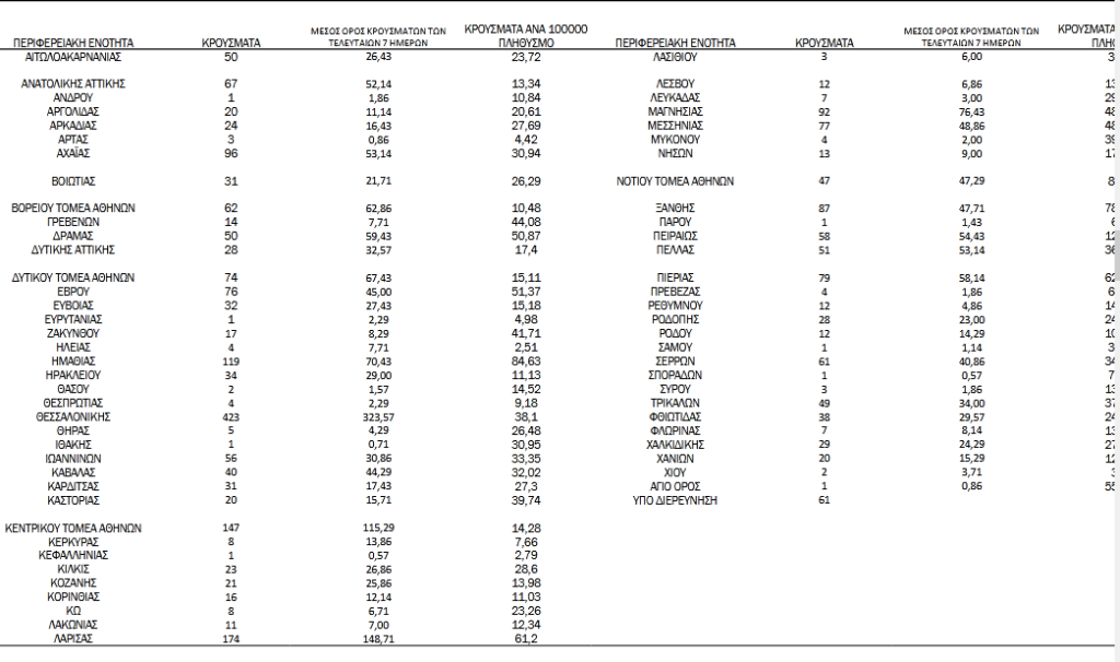 1 Με βάση τα επιβεβαιωμένα κρούσματα των τελευταίων 7 ημερών, 107 θεωρούνται σχετιζόμενα με ταξίδι από το εξωτερικό και 2.059 είναι σχετιζόμενα με ήδη γνωστό κρούσμα.